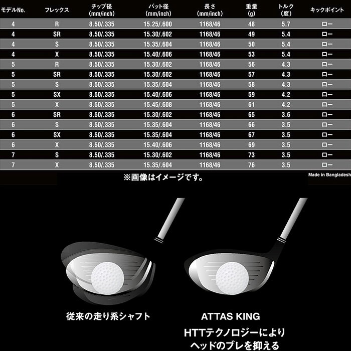 歴代ATTASシリーズの中でも、最も先端の走り感を追求したのがこの「ATTAS KING」です。シリーズ初となる先調子を採用し、インパクトゾーンでヘッドが鋭く加速。これにより、ボールをしっかりと捕まえ、高弾道のドローボールを打ちやすくしてくれます。